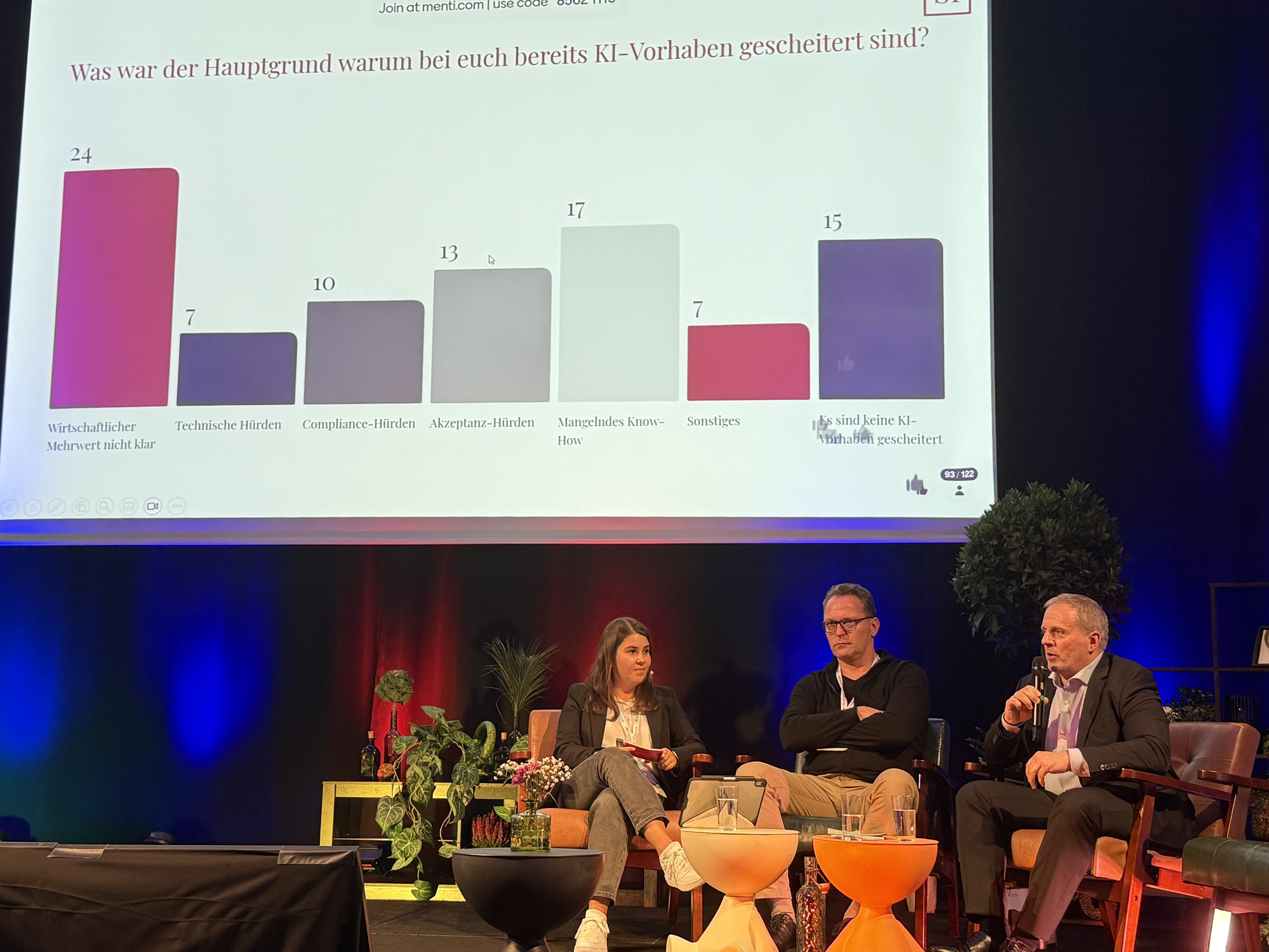 Das Ziel unseres Panels: hinter die Buzzwords rund um KI zu schauen und zu verstehen, was wirklich zählt, wenn Technologie auf Organisation trifft. Gemeinsam mit dem Publikum haben wir internationale Studien direkt auf der Bühne empirisch für Österreich überprüft, mit spannenden Ergebnissen.